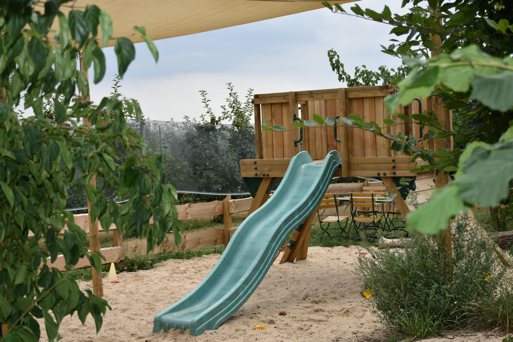 ….haben wir einen großzügigen, eingezäunten Spielbereich neben der Apfelplantage. Sollte es mal regnen steht innen eine Spiel- und Malecke für die Kleinen bereit!